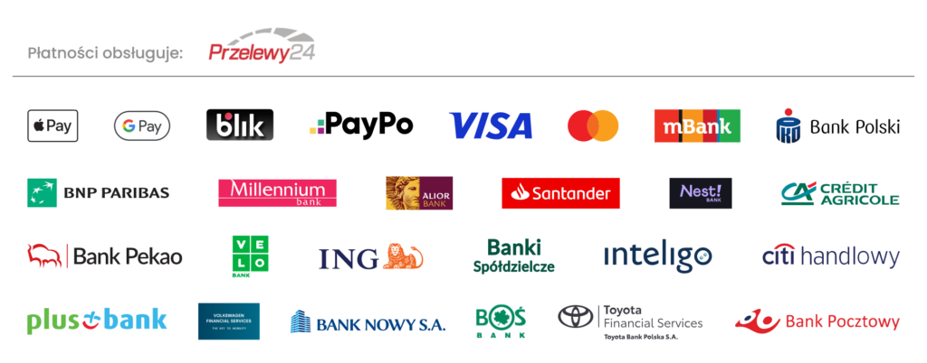 Na naszym sklepie płatności internetowe tzw. „szybki przelew” obsługiwane są przez firmę PRZELEWY24 (PayPro SA (PayPro)) –z siedzibą w Poznaniu, przy ulicy Pastelowej 8 (60-198), wpisany do rejestru przedsiębiorców Krajowego Rejestru Sądowego prowadzonego przez Sąd Rejonowy Poznań Nowe Miasto i Wilda, VIII Wydział Gospodarczy Krajowego Rejestru Sądowego pod numerem KRS 0000347935, numerem NIP 7792369887.