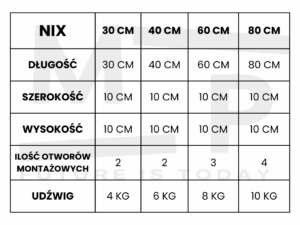 - udźwig: mimo lekkiej konstrukcji, półka utrzymuje znaczący ciężar – bez wyginania się czy chybotania (dokładna informacja o udźwigu znajduje się w sekcji ” Tabela rozmiarów” )